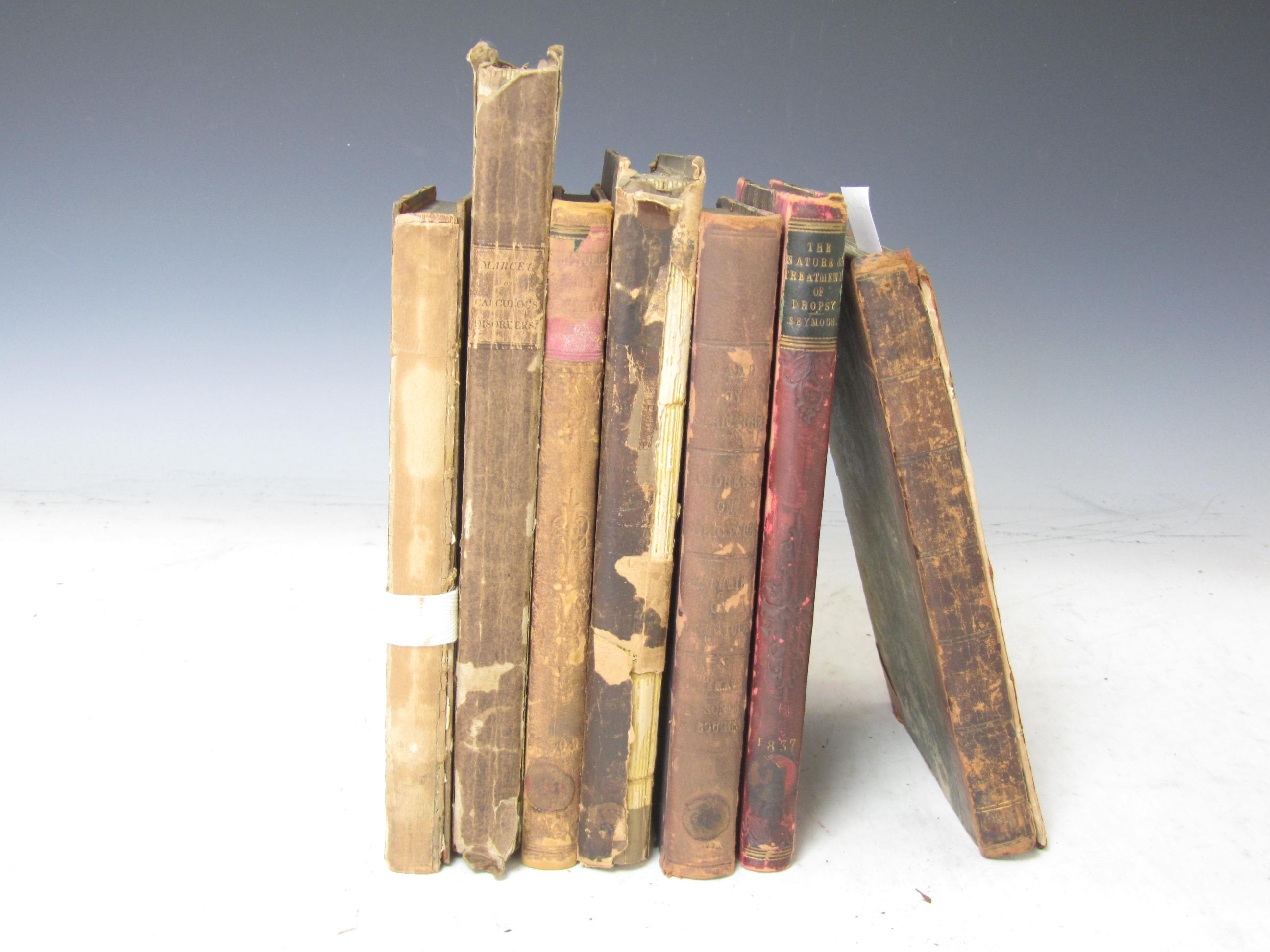 On the anatomy and diseases of the neck of the bladder and of the urethra. London, 1834. First edition, 8vo, 3 hand-coloured plates, title & upper board detached; Marcet, Alexander An essay on the chemical history and medical treatment of calculous disorders. London, 1817. 8vo, original boards, uncut; Wadd, William Observations of the best mode of relieving strictures in the urethra. London, 1811. 8vo, frontispiece; bound with 2 others, contemporary half calf; Luxmoore, Thomas Practical observations on strictures of the urethra. London, 1809. 8vo, contemporary half calf, rubbed; Stafford, R.A. A series of observations on the strictures of the urethra. London, 1829. 8vo, 1 folding plate, original boards, rubbed; Dufour, W. A treatise on diseases in the urinary canal. London, 1801. 8vo, bound with another, contemporary half calf, one board detached; and 30 others, similar, nineteenth century (36)