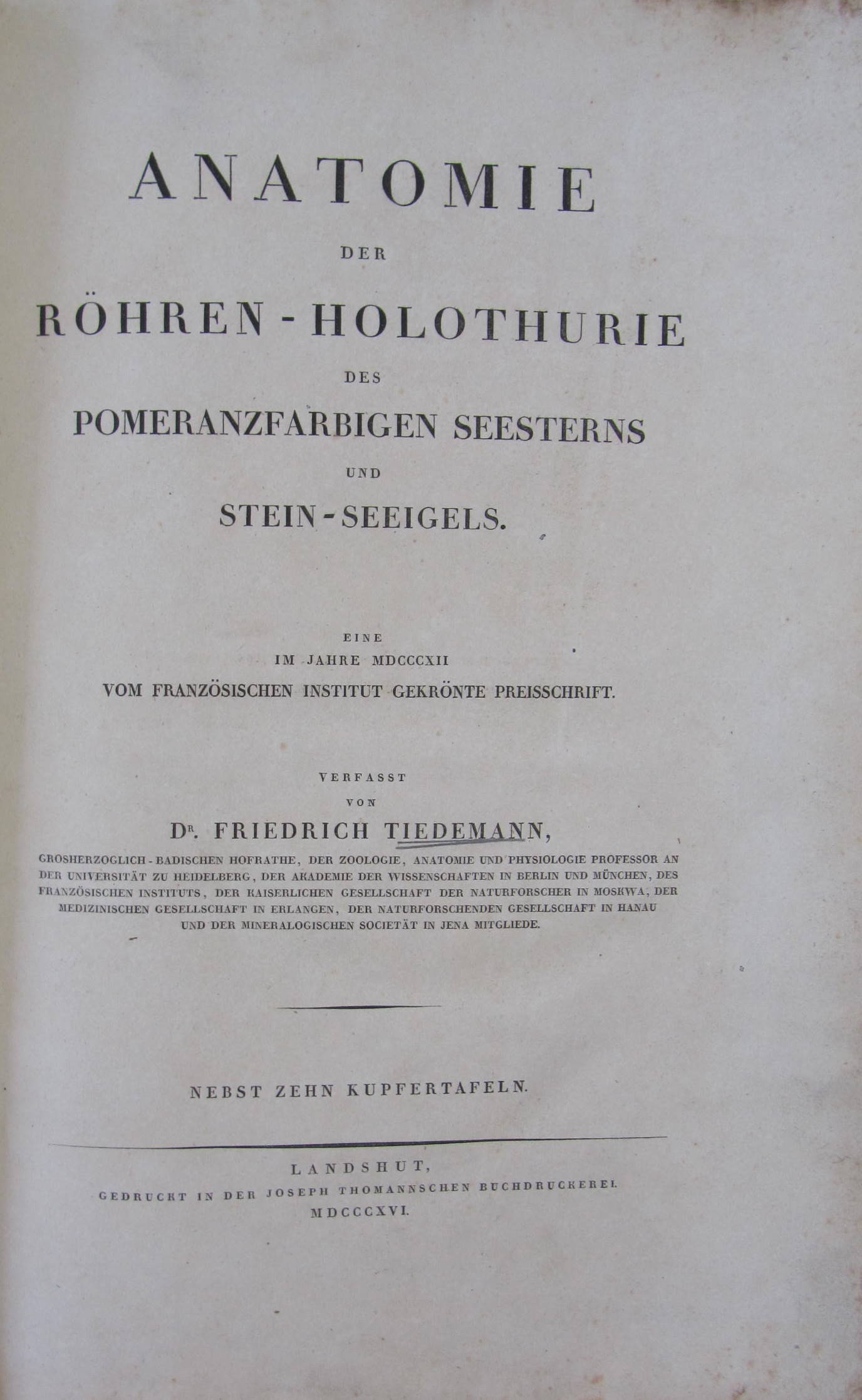 Anatomie der rohren- holothurie... Landshut: Joseph Thomannschen, 1816. Folio, 10 engraved plates [mounted on guards with additional title], contemporary marbled boards, worn at edges, interior clean, no library stamps; [Idem] Tabulae nervorum uteri. Heidelberg, 1822. Folio, portrait frontispiece, 4 plates [2 in outline], contemporary boards, heavy foxing throughout, library stamps (2)