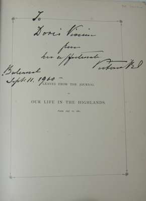 Leaves from the journal of our life in the Highlands from 1848 to 1861. London: Smith, Elder & Co., 1868. 4to, presentation copy inscribed "To Doris Vivien, from her affectionate Victoria R.I., Balmoral, Sept. 11, 1900", 8 engraved plates, 2 chromolithographed plates, vignettes, original pictorial red cloth gilt, g.e.