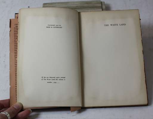 The waste land. New York: Boni and Liveright, 1922. First edition, 8vo, number 586 of 1000 copies (stamped figures 2 mm. high), later issue (with "mount in" on p. 41), original black cloth gilt, dustwrapper, collector's folding case, extensive dampstaining, dampstained wrapper worn with numerous tears and some loss together with adhesive tape repairs