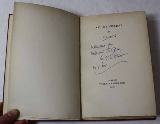 Ash Wednesday. London: Faber & Faber, 1930. First edition, 8vo, presentation copy from the author ("inscribed for William S. Gray/ by T.S. Eliot / 19.v.64"), original orange cloth gilt, waterstaining to boards and endpapers