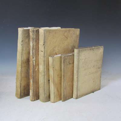 Six vellum bound ledgers and cash books relating to estates at Shermanbury, Sussex, belonging to the Challen family, and dating variously from 1757 to 1837, comprising a ledger of approx 280 pages, folio, 1757-1793; Day book, 1757-1786, folio, approx 349 pages; Account book, 1798-1812, folio; Cash book of approx 166 pages, 1757-1794, small 4to; Tenants book, 1821-1832, small 4to; Farming account book, 1832-1837, 4to, between Dr. Challen and Thomas Page of Ewhurst Farm (6)