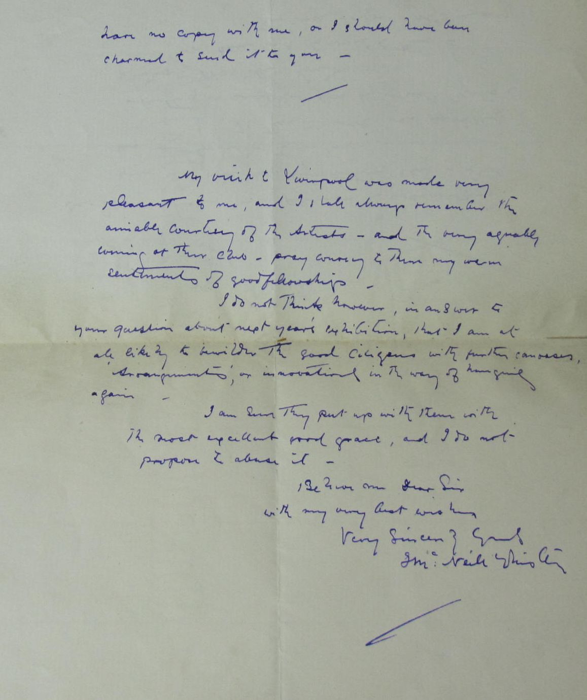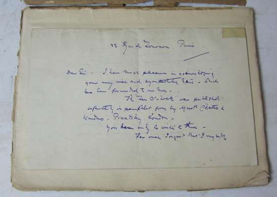 Autograph letter signed to an unnamed correspondent, Paris, [c.1888], 2 pages, regarding his publication Ten o'clock, his recent visit to Liverpool "pray convey to them my warm sentiments of fellowship" and the following year's exhibition stating he not likely to "bewilder the good citizens with further canvases, arrangements or innovations in the way of hanging again...", tipped onto the title of a copy of his Ten o'clock