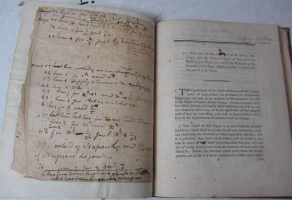 [Contributions to the Transactions of the Royal Society of Edinburgh & other journals]. 4to, Some geometrical porisms, [c.1796], 4 folding plates; A new method of expressing the coefficients of the development of the Algebraic formula, [c.1802]; New series for the quadrature of the conic sections, and the computation of logarithms. [c.1808], 2 autographed ms. of corrections bound in, and corrections made to text, folding plate; Investigation of formulae, for the finding the logarithms of trigonometrical quantities. Edinburgh, 1823, 2 parts, 5pp. autographed trigonometrical calculations bound in; On the burial place of John Napier of Merchiston, the inventor of Logarithms. 1831; A General theorem relating to regular polygons. [c.1824]; Royal Astronomical Society, vol. 3, no. 17, 2pp.; most publications inscribed at head by William Wallace, with autographed ms. index at beginning, half calf, neatly rebacked, spine gilt