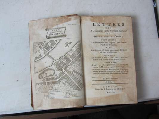 Letters from a gentleman in the north of Scotland to his friend in London... London: S. Birt, 1754. First edition. 8vo, 2 volumes, plan frontispiece, 8 plates, contemporary calf gilt, worn, hinges splitting, offsetting and browning to title, foxing, bookplates (2)
