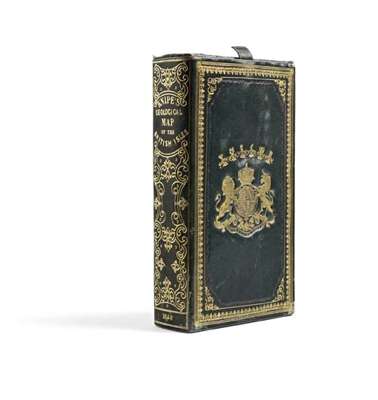 Geological map of the British Isles and part of France... London, 1848. 4 sheets, each approx. 81.5 by 68cm, original decorative green morocco slipcase, four copies of the original paper advertising leaflet included, some slight rubbing to slipcase
