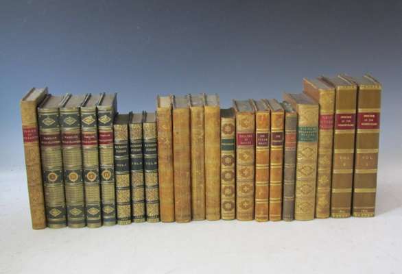 The works of Mr Hogarth moralized. London, 1768. 8vo, frontispiece, engraved vignette title, 19th century speckled calf gilt, a.e.g., marble endpapers, bookplate; Hulme, F. Edward Familiar wild flowers. London, [no date]. 8vo, 4 volumes, colour plates, contemporary half calf gilt, some patches of rubbing to backstrips, some foxing; Burns, Robert The poetical works of Robert Burns. London, 1839. 12mo, 3 volumes, later half morocco gilt; and a selection of other 8vo volumes bound in calf gilt (qty)