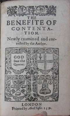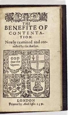 The benefite of contentation. Newly examined & corrected by the author. London: Abell Jeffries., 1591. 8vo, 20 unnumbered leaves, large woodcut first initial and headpiece, title-page with large and curious printer's woodcut device, 19th century morocco gilt, a little rubbed and scuffed, light waterstain to upper part of middle leaves, a few marginalia, lower blank margin of 4 leaves cut away at lower edge