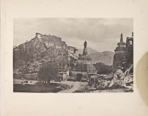 White's photographs comprise the earliest and most extensive photographic record of the interior and peoples of Tibet. Messrs. Johnston & Hoffmann of Calcutta published the photographs as a two volume album, dated 1907-08, and a smaller format one volume album of photographs in 1908. Copies of the 1907-08 publication are extremely rare (only a handful of copies are known). Each photograph has an accompanying leaf or leaves of descriptive text. The photographs depict the Khamba Jong (2), Mount Everest from Khamba Jong, Group of Nuns, The Abbot at Khamba Jong, Chonghu, The Amo Chu River, Phema, Bridge at Phema, Phari Jong, Samuda, Yaks in Ekkas, Gyantze Jong, The Goorkha Post, Nishi Kang Sang Glacier (2), View of the Yamdok Tso (2), The Tsanpo or Brahmaputra Valley, Chaksam Ferry (3), Two Views up the Kyichu Valley (2), Troilung Bridge, Debung Monastery, A Group of Lamas of Debung Monastery, An image in one of the Gumpas of Debung Monastery, Nejung Monastery (4), The Astrologer's Summer Residence, Sera Monastery, Street scence in Sera Monastery, The Two Stewards and Senior Lamas of Sera Monastery, The Entrance to Lhasa, A Street Scene in Lhasa, A Doring or Monument outside the Jowo Khang, The Lingkor or sacred circular road of Lhasa, The Potola (8), The Regent, The Shapes, Tongsa Penlop and his Retinue, The Chinese Amban, & Panorama of Lhasa (folding).