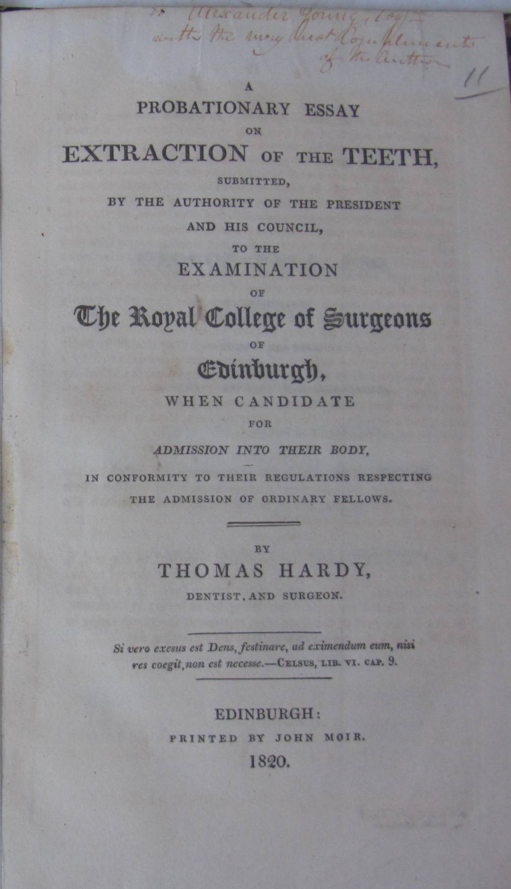 A probationary essay on extraction of the teeth, submitted, by the authority of the President and his council, to the examination of The Royal College of Surgeons of Edinburgh, when candidate for admission into their body. Edinburgh: John Moir, 1820. First edition, presentation copy from the author, inscribed in ink on the title To Alexander Young Esq. with the very best compliments of the Author, 8vo, [25pp.], marbled boards