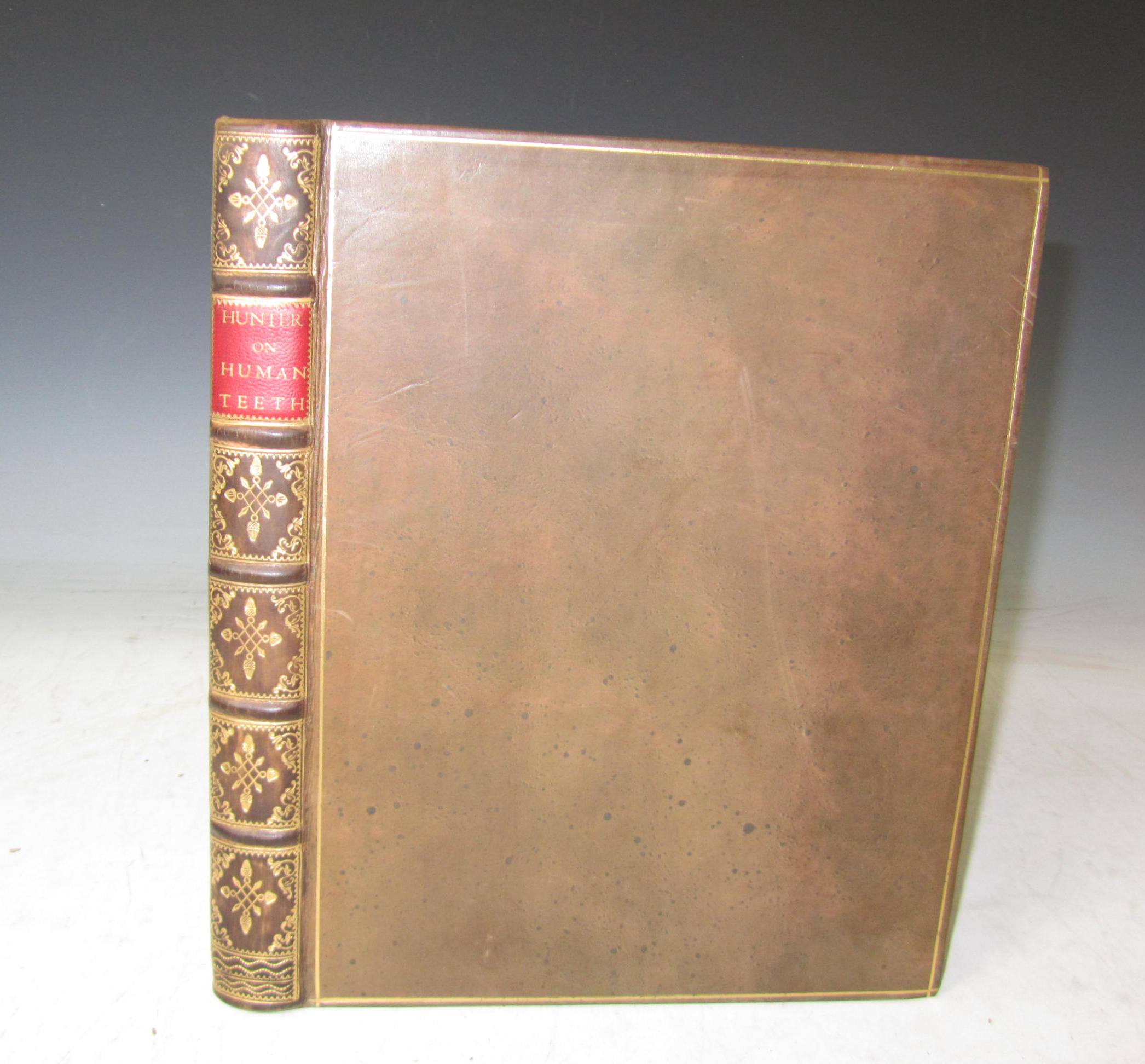 The natural history of the human teeth. London: J. Johnson, 1771. [8], 128, [16], 16 engraved plates, half-title, contemporary ownership inscription of Tho. Fowler on title in ink; [bound with] Hunter, John A practical treatise on the diseases of the teeth, intended as a supplement to the natural history of the human teeth. London: J. Johnson, 1778. [6], iv, 128, [8], half-title. Two works in one volume, first editions, 4to., recent antique style calf gilt, gilt fillet to covers, spine gilt, red morocco label