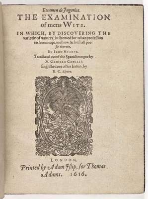 Carew and Bellamy's translation of Huarte's Examen de Ingenios (through the medium of Camillo Camilli's Italian version) has the strongest claim to be considered the first modern work on psychology in the English language. First printed in 1575, the work rapidly achieved European popularity and the status of a classic medical text.