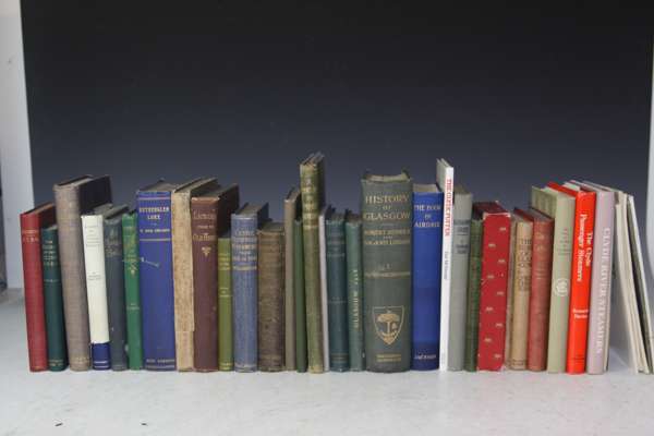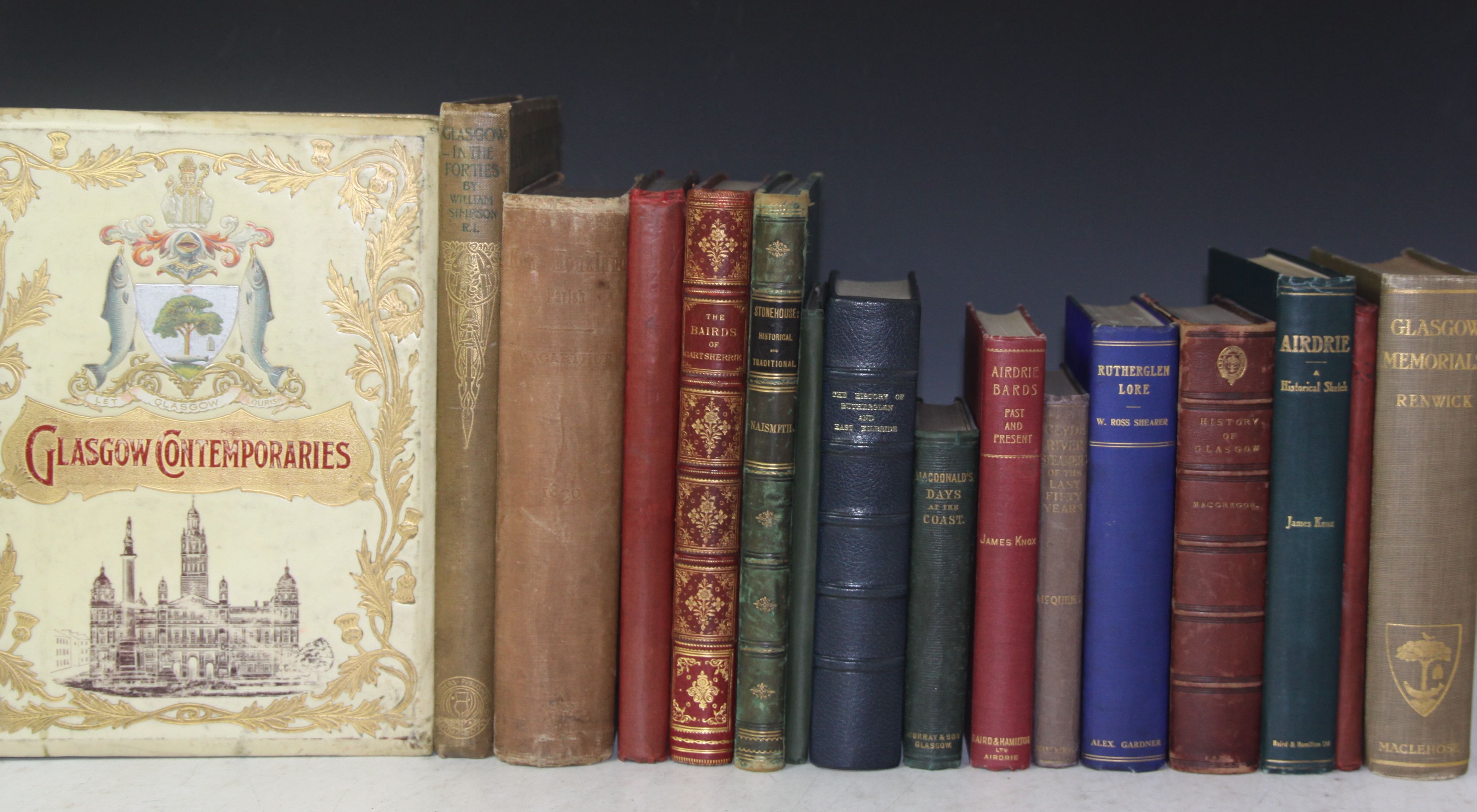 Glasgow in the Forties. 1899. 4to, original cloth; Glasgow contemporaries. [c.1900]. 4to, original hand-coloured and gilt vellum binding, g.e.; Macarthur, John New Monkland Parish. 1890. 4to, original brown cloth, slightly rubbed; Historical, biographical and literary sketches of Glasgow and Lanarkshire. Part 1 only. 1904. 4to, original cloth, rubbed; [MacGeorge, Andrew] The bairds of Gartsherrie. 1875. 4to, hand-coloured coats of arms, contemporary red morocco gilt, neatly rebacked retaining original spine, corners repaired, g.e.; Naismith, Robert Stonehouse: historical and traditional. 1885. 4to, contemporary half calf, rubbed; Deas, James The Clyde. 1884. 8vo, original cloth, tear to folding plan; Renwick, Robert Glasgow memorials. 1908. 4to, original cloth, some spotting; Wilson, James A. A history of Cambuslang. 1929. 8vo, original cloth; McQueen, Andrew Echoes of old Clyde paddle-wheels. 1924. 8vo; McQueen, Andrew Clyde river-steamers of the last fifty years. 1923. 8vo, original cloth; Callant, A.G. Saint Mungo's Bells. 1888. 8vo, original cloth, rubbed and soiled; "Nestor" Rambling recollections of old Glasgow. 1880. 8vo, original cloth; Shearer, W.R. Rutherglen lore. 1922. 8vo, original cloth; MacGregor, George The history of Glasgow. 1881. 8vo, maroon half morocco, t.e.g., lightly rubbed; Bennett, R. Echoes of the past. Sketches & stories of Ru'glen-on-the-Clyde. 1892. 8vo, original cloth, soiled; Knox, James Airdrie, a historical sketch. 1921. Large 8vo, original cloth; Knox, James Airdrie Bards past and present. 1930. 8vo, original cloth; MacDonald, Hugh Days at the coast. 1857. 8vo, frontispiece map, original cloth, slightly rubbed; Ure, David The history of Rutherglen and East Kilbride. 1981. 8vo, facsimile edition, blue leather; Lang, J.M. Glasgow and the barony thereof. 1895. 4to, original boards, worn; [Paisley] Lichens from an old Abbey. Paisley, 1876. 8vo, original cloth; MacDonald, Hugh Rambles round Glasgow. 1910. 12mo, original cloth; Williamson, James The Clyde passenger steamer. 1904. 8vo, original cloth; M'Donald, Hugh Rambles round Glasgow. 1856. Second edition, 12mo, original cloth, joints split; and 20 volumes and 7 pamphlets; sold not subject to return (53)