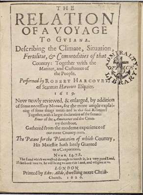 Second edition of Harcourt's rare early description of Guiana, issued by him to promote interest in the struggling settlement he had founded at the mouth of the Wiacopo. His descriptions of the various commodities in the country, such as sugarcane, gold, cotton, amber, honey, wax, and tobacco and colourful first hand accounts of the habits, food, drink and beliefs of the indigenous Indians, and curious local animal, sea, and plant life met with success and enabling him to return to the colony where he died of fever in 1631.
