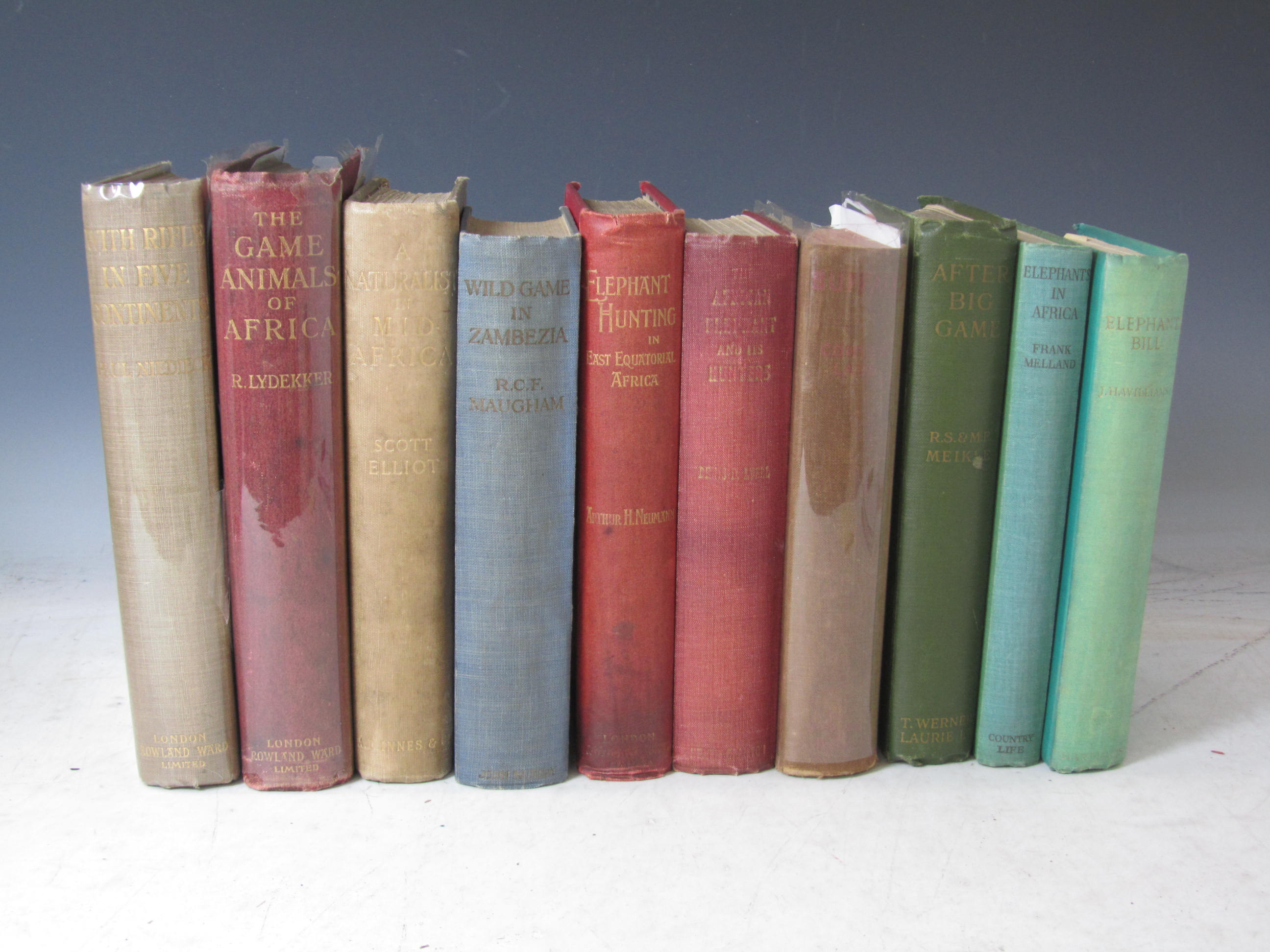 With rifle in five continents. London: Rowland Ward, 1908. 8vo, half title, original cloth gilt; Neumann, Arthur Elephant hunting in East Equatorial Africa. London, 1898. 8vo, folding map in pocket at rear, frontispiece, colour plate, original red cloth gilt, backstrip rubbed and faded, corners bumped, contemporary ink inscription on title; Lydekker, R. The game animals of Africa. London, 1908. 8vo, original red cloth gilt; Elliot, G.F. Scott A naturalist in mid-Africa. London, 1896. 8vo, frontispiece, original cloth gilt, stained; Maugham, R.C.F. Wild game in Zambezia. London, 1914. 8vo, frontispiece, folding map, original cloth, foxing; and 9 others on game and hunting (13)