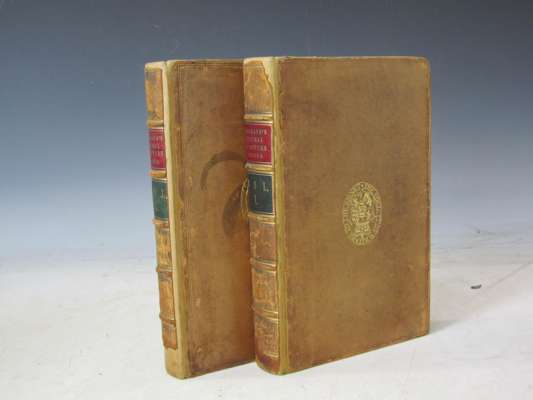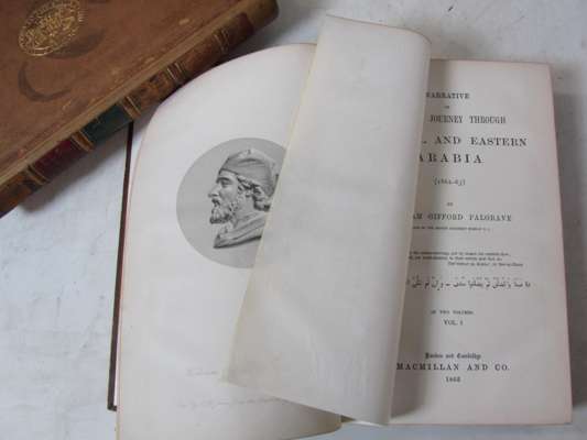 Narrative of a year's journey through central and Eastern Arabia (1862-63). London: Macmillan & Co., 1865. First edition, 2 volumes, 8vo, engraved frontispiece, folding map hand-coloured in outline, and 4 folding plans, contemporary calf, arms of The Society of Writers to the Signet on covers, small tear and repair to folding map, rebacked retaining original spines