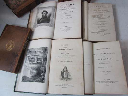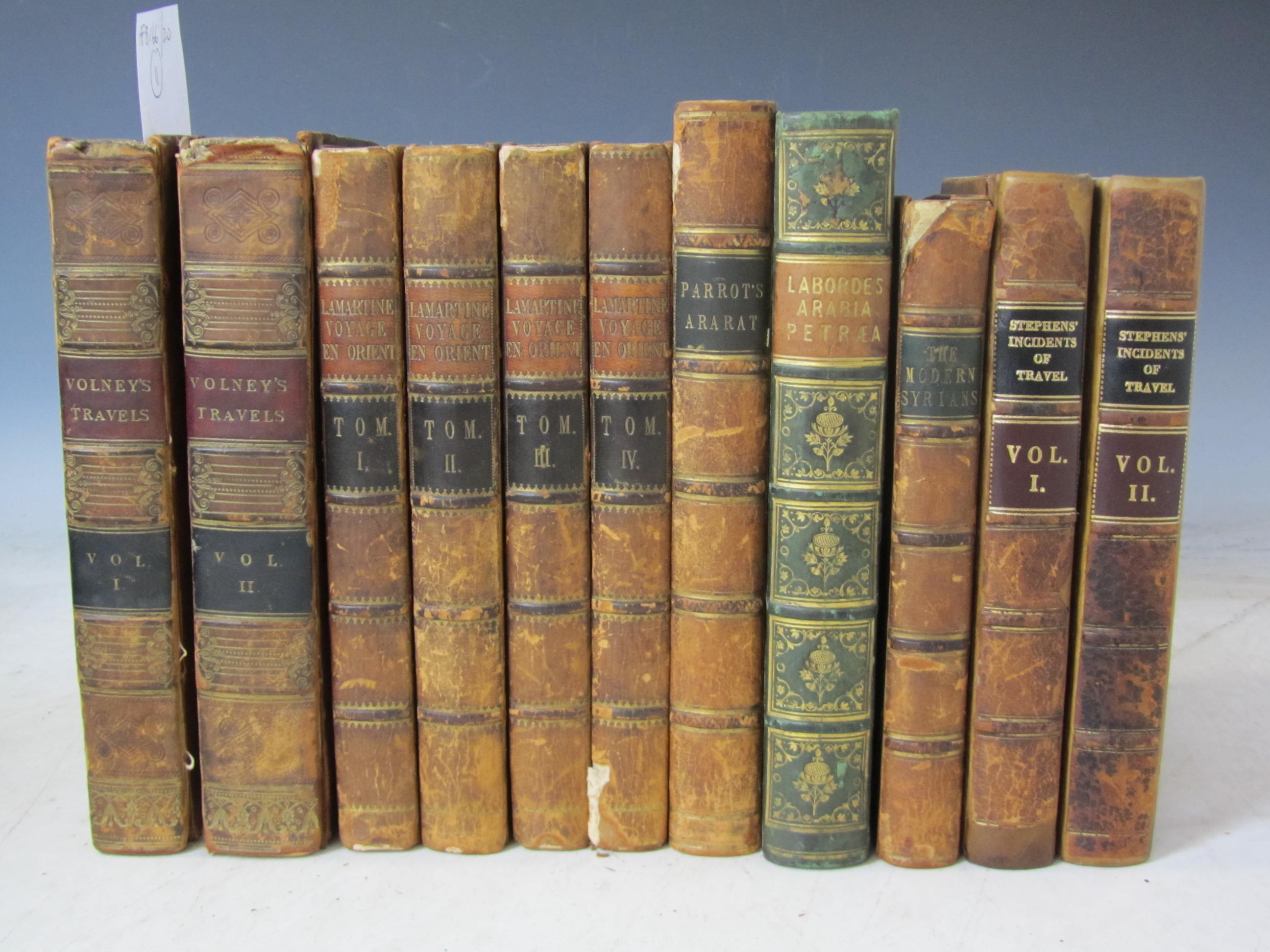 Travels through Syria and Egypt. London: G.G.J. and J. Robinson, 1788. Second edition, 2 volumes, 8vo, 2 folding maps, 2 folding plates & folding plan, contemporary calf, arms of The Society of Writers to the Signet on sides, some spotting and dampstaining, rubbed, joints split; Laborde, Leon de Journey through Arabia Petraea. London: J. Murray, 1836. 8vo, folding map & 25 plates, contemporary half calf, some spotting; [Paton, A. The modern Syrians. London: Longman &c., 1844. 8vo, contemporary calf, arms of The Society of Writers to the Signet on covers, worn; Stephens, George Incidents of travel in Egypt, Arabia Petraea and the Holy Land. London, 1838. New edition, 2 volumes, 8vo, contemporary calf, arms of The Society of Writers to the Signet on covers, name "John Lloyd Stephens" inscribed in ink on titles, rebacked retaining original spines, rubbed, new lettering pieces and endpapers; Parrot, F. Journey to Ararat. [Volume 1 of The World Surveyed in the XIXth century, edited by W.D. Cooley]. 8vo, folding map, contemporary calf, arms of The Society of Writers to the Signet on sides, rubbed; Lamartine, A. de Souvenirs, impressions, pensées et paysages pendant un voyage en Orient. Paris: C. Gosselin, 1835. First edition, 4 volumes, 8vo, portrait, 2 folding maps & folding table, contemporary calf, arms of The Society of Writers to the Signet on sides, spines worn; Velde, C.W.M. van de Narrative of a journey through Syria and Palestine. Edinburgh: W. Blackwood, 1854. 2 volumes, 8vo, 3 plates (2 folding), folding plan and map, contemporary half calf, arms of The Society of Writers to the Signet on sides, worn (13)
