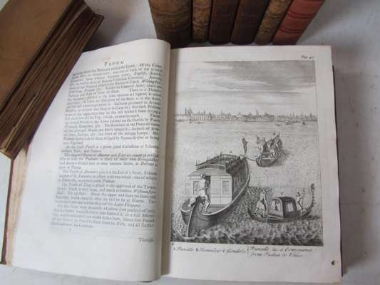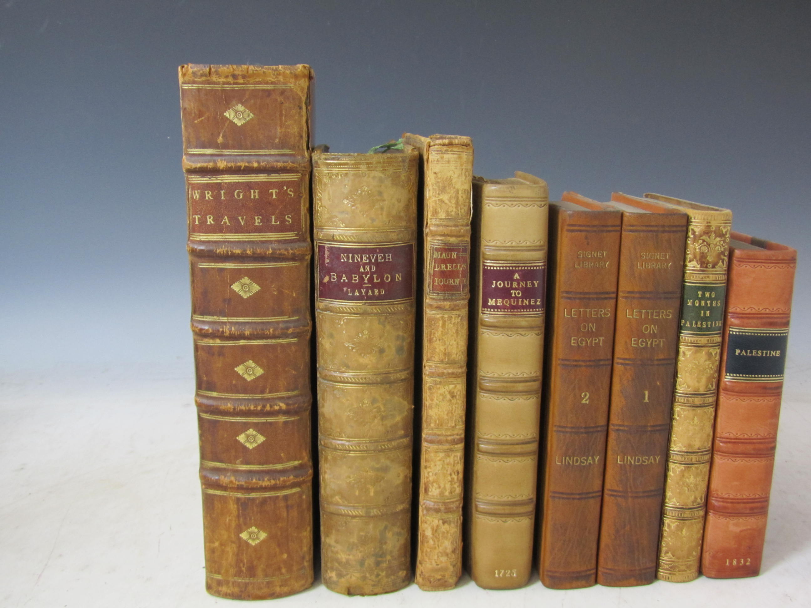 Some observations made in travelling through France and Italy. London, 1730. 4to, 2 volumes in one, 41 engraved plates, contemporary calf, small split to head of upper joint; Lindsay, A.W.C. Letters on Egypt, Edom and the Holy Land. London: H. Colburn, 1838. 2 volumes, 8vo, lithographed frontispieces, modern morocco-backed cloth, Signet Library stamp at head of spines; Maundrell, Henry A journey from Aleppo to Jerusalem. Oxford: Theatre, 1749. 8vo, engraved title-vignette, 15 engraved plates, contemporary calf, rubbed, joints splitting; Layard, Austen H. Discoveries in the ruins of Nineveh and Babylon. London: J. Murray, 1853. 8vo, 2 folding maps & 14 plates, some folding, contemporary calf, a trifle rubbed; [Palestine] Two months in Palestine. 1871. 8vo, frontispiece, contemporary calf; Russell, Michael Palestine or the Holy Land. Edinburgh, 1832. Third edition, 12mo, folding map, illustrations, some full-page, half calf; Windus, John A journey to Mequinez. London: J. Tonson, 1725. First edition, 8vo, 6 folding plates, modern calf, two plates split at fold without loss, some spotting and minor dust-soiling (8)