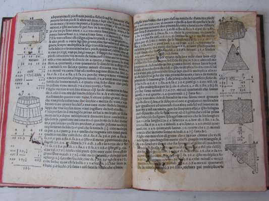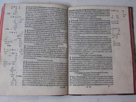Libro di arithmetica & geometria speculativa & practicale. [Venice: Francesco di Alessandro Bindoni, & Mapheo Pasini], 1550. 4to, title within woodcut border, marginal woodcuts and mathematical computations, 18th century half calf, lacks S1-4, worming to Q4, R1-2, T2-4 with some loss of text, some marginal dampstaining, head of spine rubbed
