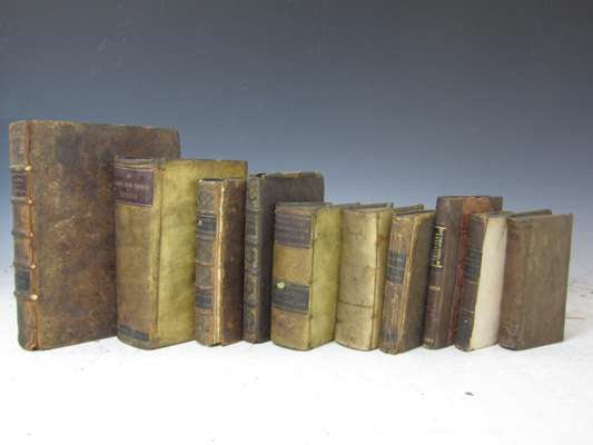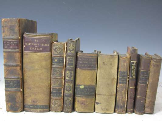 Schola salernitana, de valetudine tuenda. Paris: L. Billaine, 1673. 8vo, folding plate, contemporary vellum; Commelin, Joannes Catalogus plantarum horti medici Amstedodamensis. Amsterdam: A. Oosaen, 1689. Part 1 [all published]. 8vo, engraved frontispiece, contemporary calf, library stamps, rubbed, cover detached; Abeille, Scipion Le parfait chirurgien d'armée. Paris: J. Guignard, 1696. 8vo, contemporary calf, slight dampstaining, rubbed; Bayle, F. Tractatus de apoplexia. The Hague, 1678; small hole to title; Bayle, F. Problemata physica et medica. The Hague, 1678; Bayle, F. Dissertationes physicae. The Hague, 1678; Bayle, F. Dissertationes medicae. The Hague, 1678. 4 works in one volume, 12mo, contemporary vellum, hinge broken; Fontanus, Nicolaus Institutiones pharmaceuticae. Amsterdam, 1633. 12mo, contemporary vellum, some dust-soiling; Eyssonius, Henricus Tractatus anatomicus & medicus, de ossibus infantis. Groningen, 1659. 12mo, calf, lacks upper board; Blasius, Gerardus Anatome contracta. Amsterdam, 1666. 12mo, additional engraved title, old calf, corner of engraved title torn away, rubbed, cover detached; Bayle, François Histoire anatomique d'une grossesse de vingt-cinq ans. Toulouse, 1693. 12mo, folding plate laid down, later half calf, ?lacking Contents leaf, very waterstained; Moebius, G. Fundamenta medicinae physiologica. Frankfurt & Leipzig, 1678. 4to, contemporary calf, some spotting; Deusingius, Antonius Fasciculus dissertationum selectarum. Groningen, 1660. 12mo, title printed in red and black with woodcut device, contemporary vellum, most with spotting and library stamp to title (10)