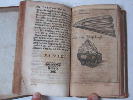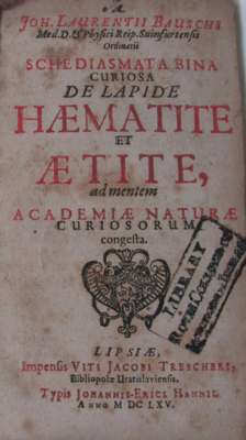 Schediasmata bina curiosa de lapide haematite et aetite. Leipzig: Johann Eric Hahn for Jacob Trescher, 1665. First edition, 8vo, 2 parts in one volume, [4], 164, [8]. 79; title printed in red and black, 7 engraved plates, 2 folding, contemporary calf, spotting and browning, library stamp on title, worn, cover detached