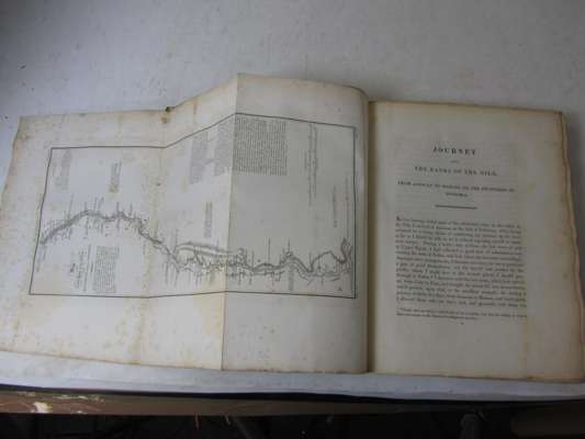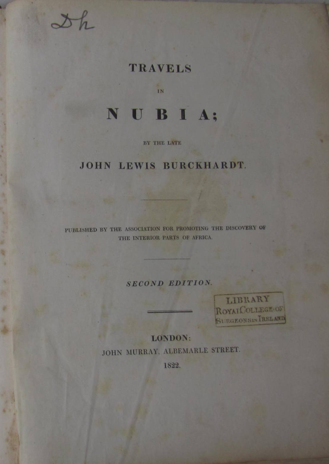 Travels in Nubia. London: J. Murray, 1822. Second edition, 4to, engraved portrait, and 3 maps, two folding, half-title, original cloth-backed boards, uncut, somewhat spotted, several leaves and covers detached, lacks part of spine, library stamp on title