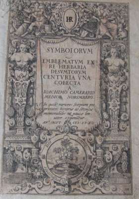 Symbolorum emblematum ex re herbaria desumatorum centuria una colecta. Nuremberg, 1590. 4to, one part only (of 4), [12], 108 (of 110) leaves, [14], engraved title and 98 (of 100) engraved illustrations in the text, lacking L2-3, several leaves repaired with loss of a few letters, title cut round and mounted, a few leaves with early annotations, a few leaves with later pencil scribble, some spotting and soiling, disbound