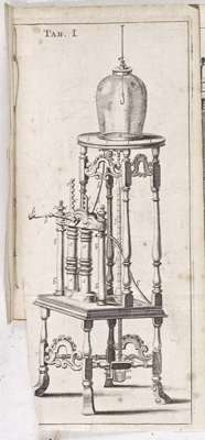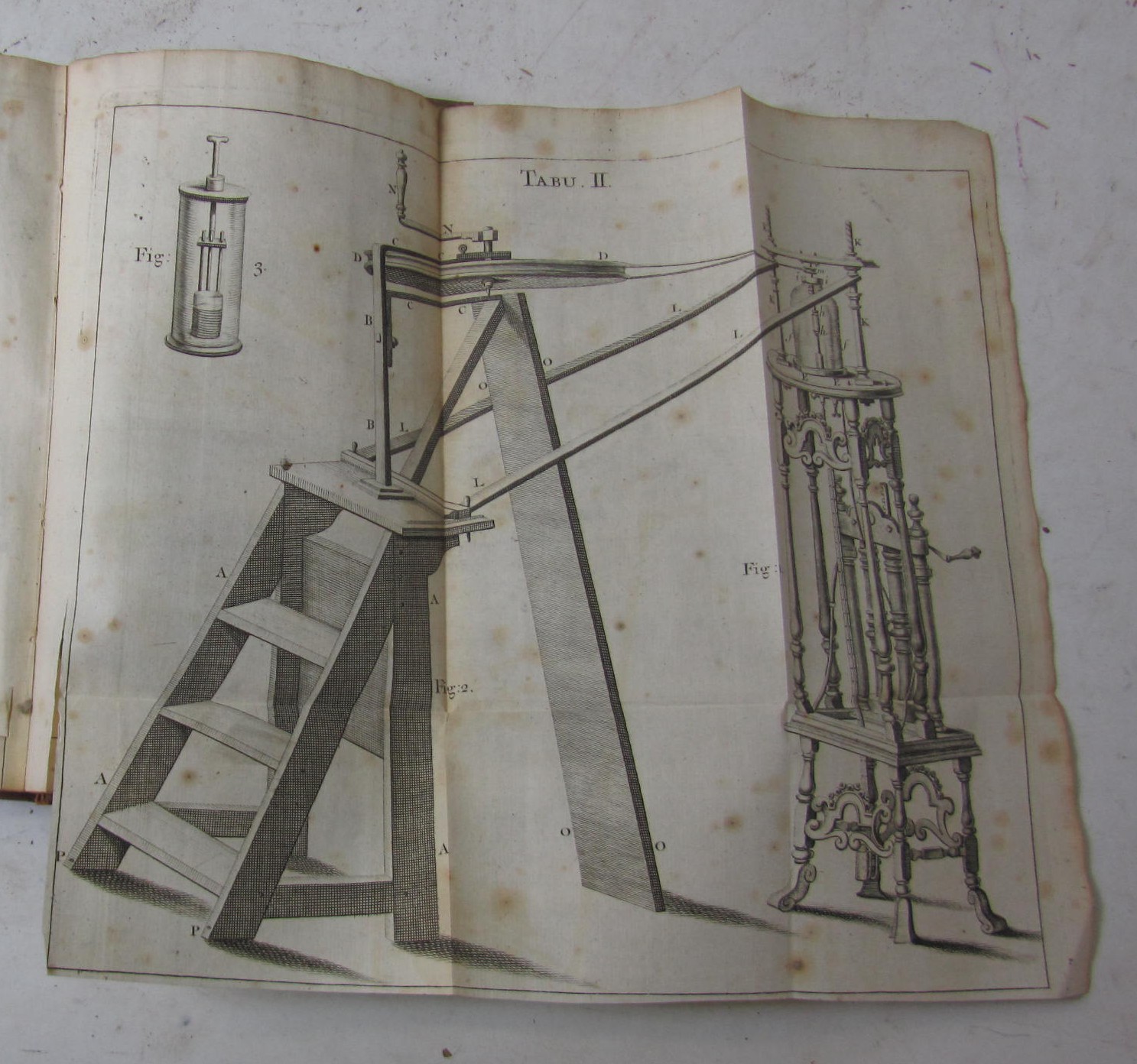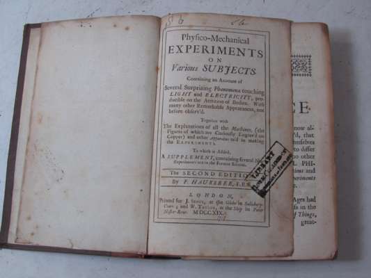 Physico-mechanical experiments on various subjects. Containing an account of several surprizing phaenomena touching light and electricity. London: J. Senex & W. Taylor, 1719. Second edition, 8vo, [xiv], 336; 8 folding engraved plates, later calf retaining original sides, upper cover detached, library stamp on title, A2-7 detached, somewhat spotted