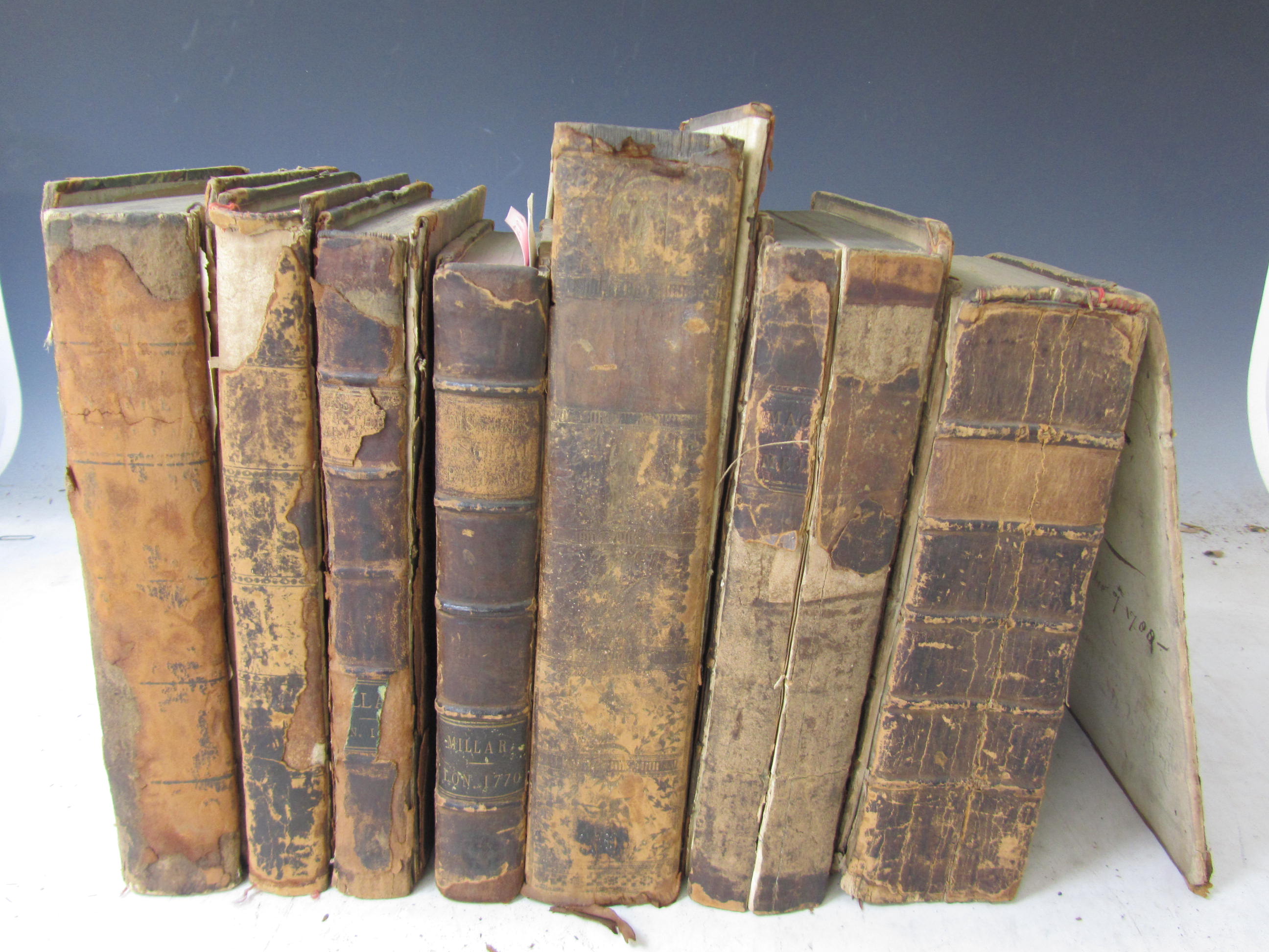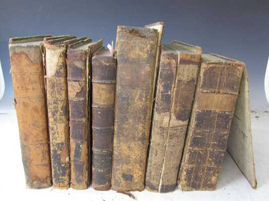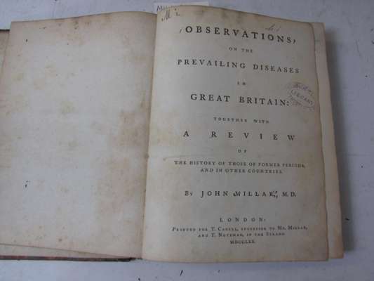 A treatise of the plague. London: G.G.J. & J. Robinson, 1791. First edition, 4to, contemporary calf, title dust-soiled and with library stamp, worn, lower cover detached; Justamond, J.O. Surgical tracts by the late J.O. Justamond, F.R.S., Surgeon to the Westminster Hospital. London: T. Cadell, 1789. 4to, contemporary half calf, spotting, especially to title, worn, covers detached; Millar, John Observations on the management of the prevailing diseases in Great Britain, particularly in the army and navy. London: for the author, 1783. 4to, advertisement leaf at end, pagination erratic but complete, contemporary half calf, some spotting, small repair to table at p.50, worn, covers detached; Idem Observations on the prevailing diseases in Great Britain. London: T. Cadell, 1770. First edition, 4to, contemporary half calf, title and upper board detached, worn; Foot, Jesse A complete treatise on the origin, theory, and cure of the lues venerea. 1792. 4to, half calf, title and last two leaves frayed without loss, spotting and dust-soiling, worn, covers detached; Monro, Alexander The works. Edinburgh: C. Elliot, 1781. 4to, 7 folding engraved plates, contemporary calf, lacks portrait & lower board, title dust-soiled, occasional light dampstaining in extreme margin, upper board detached; Macbride, David A methodical introduction to the theory and practice of physic. London: W. Strahan &c., 1772. 4to, half-title, contemporary half calf, textblock split, rather spotted, worn, covers detached; Heister, Lorenz A general system of surgery. London: W. Innys, 1743. 4to, 36 (of 38) folding plates, contemporary calf, some plates torn, occasionally with loss of margin, title soiled, fore-margin trimmed and laid down, contents somewhat soiled and spotted, covers detached; Lawrence, Thomas Vita cum conjecturis ejusdem de natura et usu partium humani corporis similarium. London: [Privately Printed], 1780. 4to, engraved portrait & 3 folding engraved plates, contemporary half calf, spotting, worn, covers detached (8)