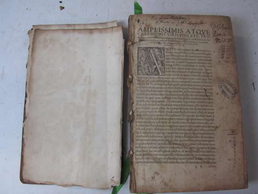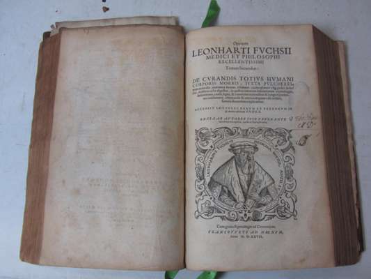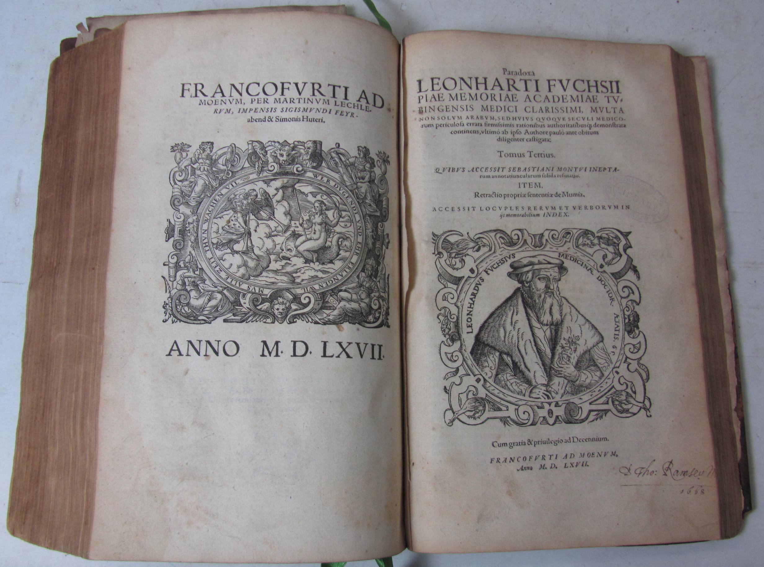 Operum Leonharti Fuchsii medici et philosophi excellentissimi. Frankfurt, [1566] - [1567]. 3 volumes, folio, titles with woodcut portrait, [30], 418, [22]; [8], 366, [14]; [16], 187, [8]; woodcuts, woodcut initials, woodcut colophon at end of volume 2, contemporary calf, volume 1 lacks title, volume 2 lacks final blank leaf, final leaf of volume 3 cut round without loss and mounted, dampstained, some early annotations, inscription of T. Thomae Ramseu M.D. 1668 on title to volume 3, *2 volume 1 soiled, worn, covers detached