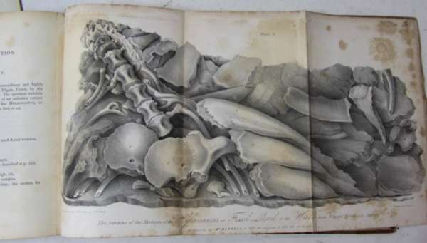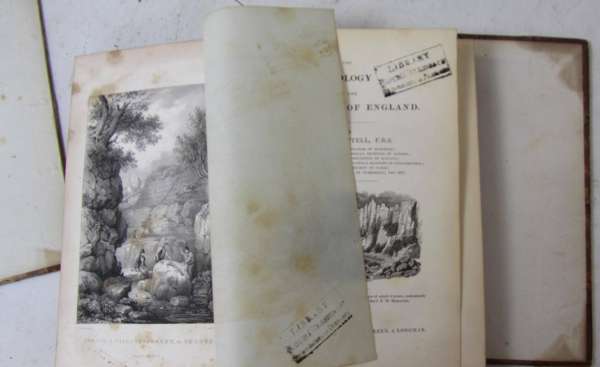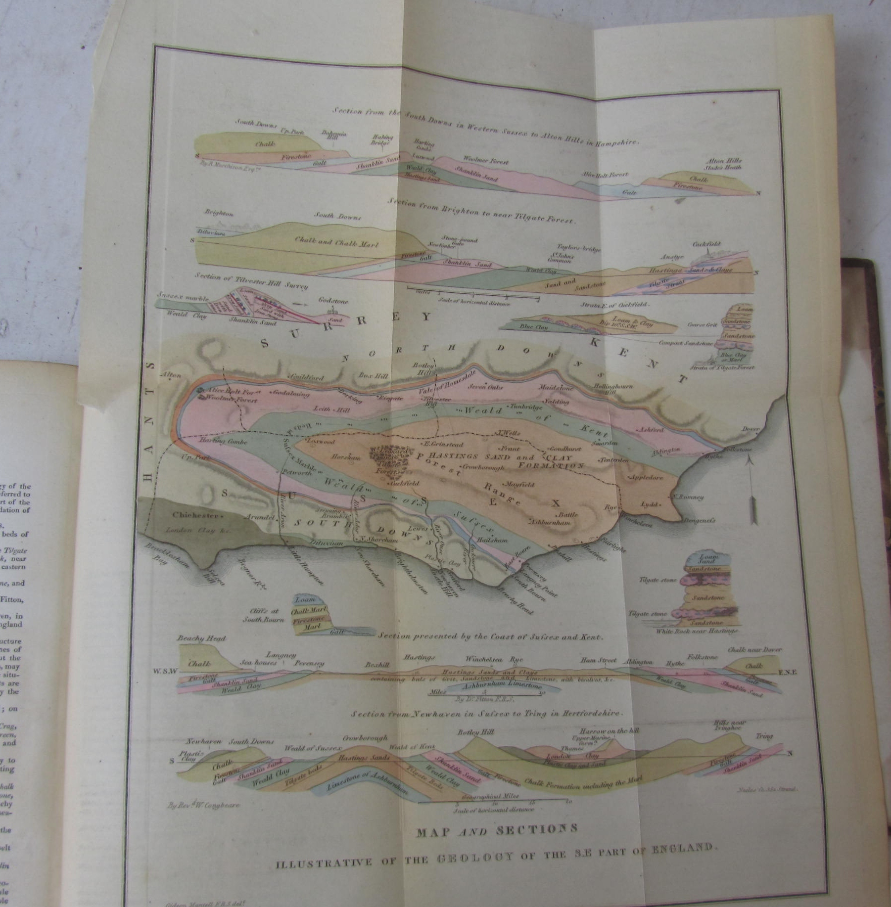 The geology of the South-East of England. London: Longman, Rees &c., 1833. First edition, 8vo, frontispiece, hand-coloured folding map, and 5 lithographed plates (1 folding), illustrations in text, contemporary half calf, plates somewhat spotted, lacks spine, covers detached, library stamp to title & several leaves of text
