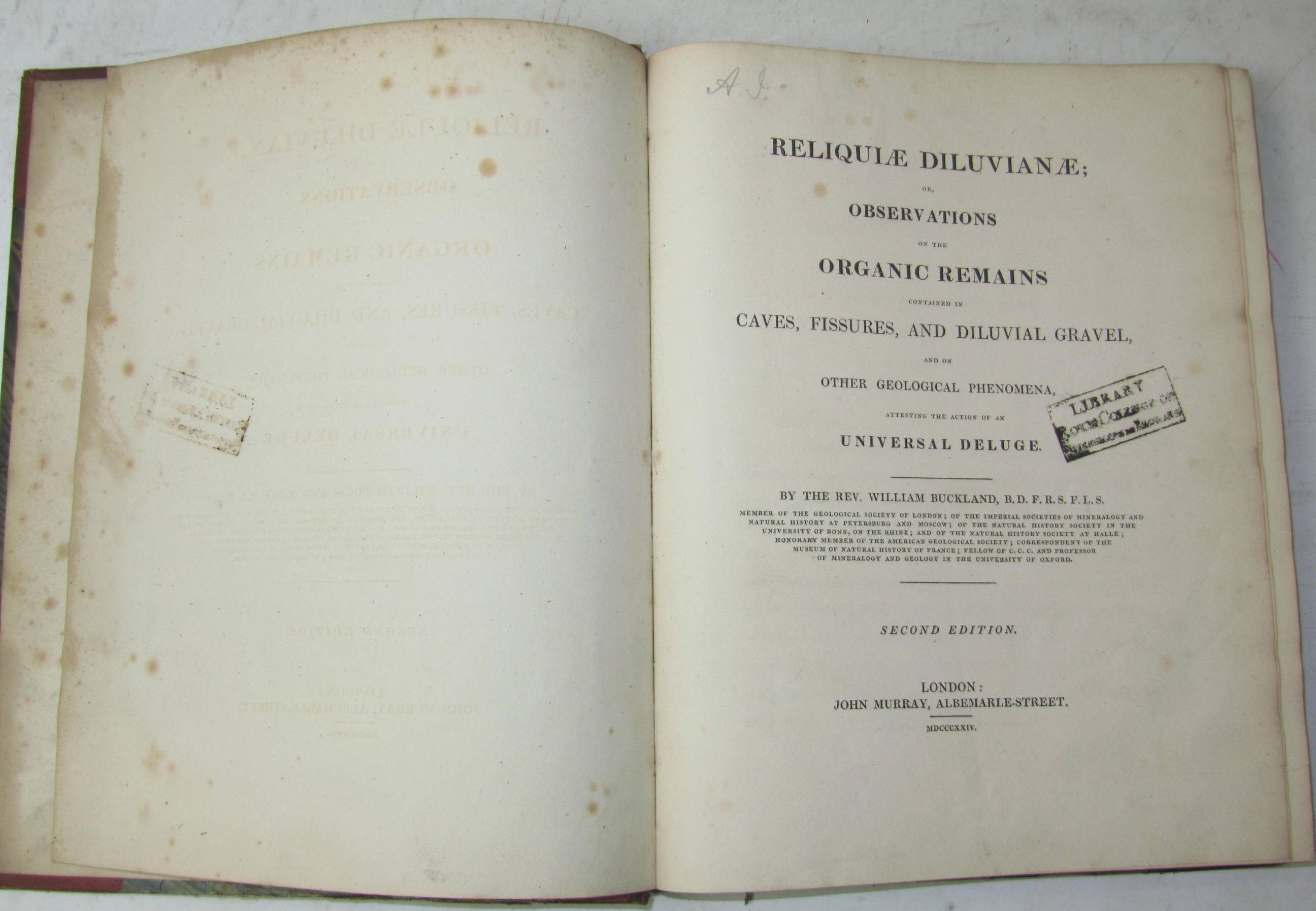 Reliquiae Diluvianae, or observations on the organic remains contained in caves, fissures and diluvial gravel. London: John Murray, 1824. Second edition, 4to, [viii; 303], folding table, 27 plates and map (3 hand-coloured, 1 folding), contemporary half calf, some spotting and marginal discolouration to plates, library stamp to title, slightly rubbed