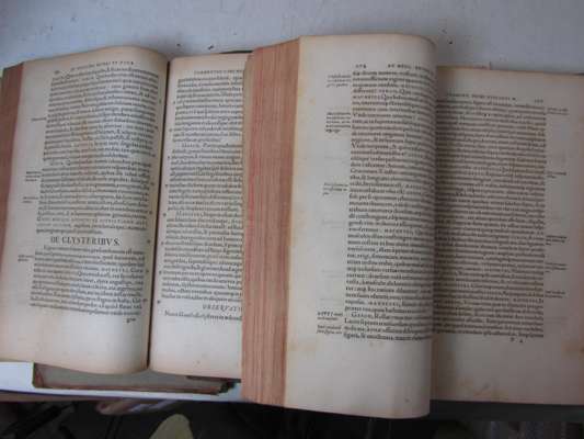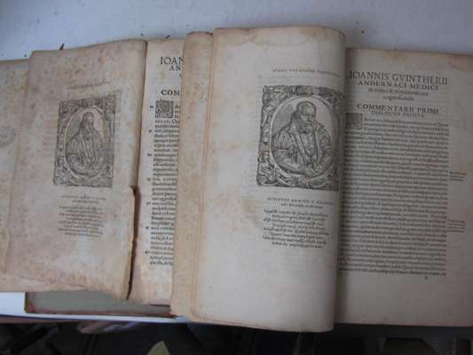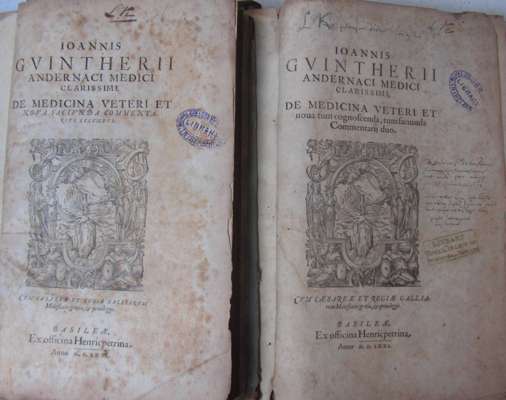 De medicina veteri et nova tum cognoscenda, tum faciunda commentarii duo. Basle: ex officina Henricpetrina, 1571. Folio, 2 volumes, [viii], 806, [28]; [iv], 867, [46]; woodcut device on titles and woodcut portraits in both volumes, early inscription in Greek and French on title of Dr. Poirier [?] dated 1678, eighteenth century calf, several library stamps, title of volume 1 spotted and loose, boards detached, volume 1 lacks upper board; first three leaves of volume 2 detached, volume 2 with numerous early annotations, browning, spotting and dampstaining
