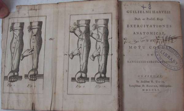 Exercitationes anatomicae, de motu cordis et sanguinis circulatione. Glasgow: R. Urie & D. Baxter, 1751. 12mo, folding frontispiece (slightly creased, torn without loss), contemporary calf, rebacked, recornered, title with library stamp and ownership name erased