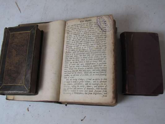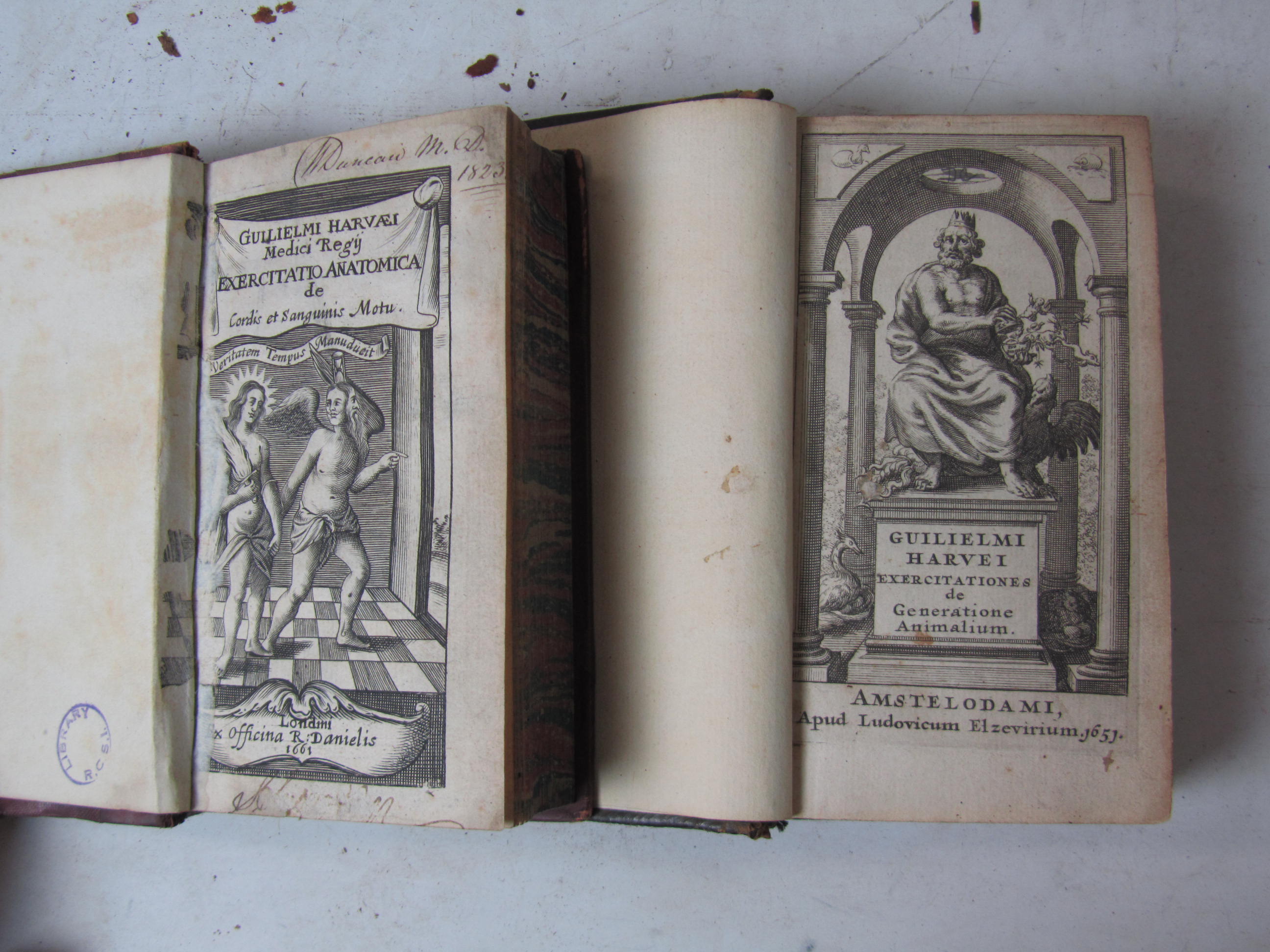 Exercitationes anatomicae, de motu cordis. London: R. Daniel, 1660. 12mo, [40], 464, [24], additional engraved title, 2 engraved plates, nineteenth century half calf, one plate just trimmed, some leaves trimmed affecting text, adhesion to engraved title with slight loss; Harvey, William Exercitationes de generatione animalium. Amsterdam: L. Elzevir, 1651. 12mo, additional engraved title, nineteenth century calf; and another, lacking text; library stamps, sold not subject to return (3)