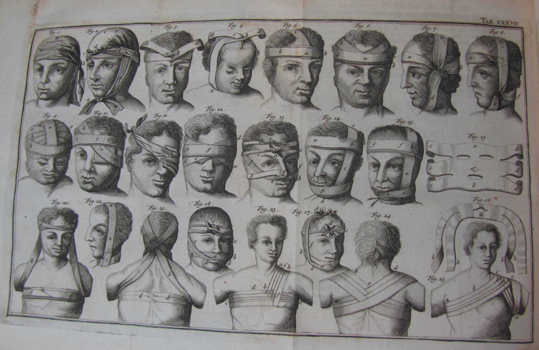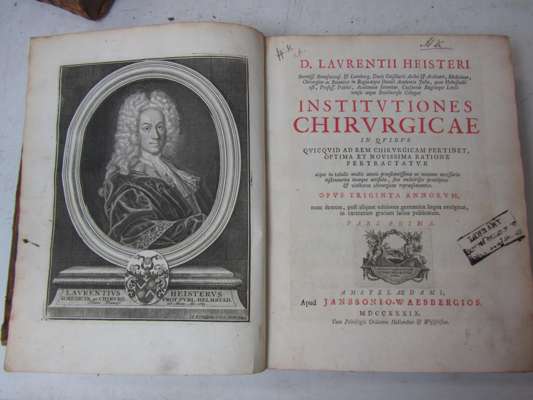 Institutiones chirurgicae. Amsterdam: Jansson-Waesberg, 1739. 2 volumes, 4to, engraved portrait and 38 folding engraved plates, titles printed in red and black, contemporary calf, library stamp to titles, spotting and occasional offsetting, worn, covers detached