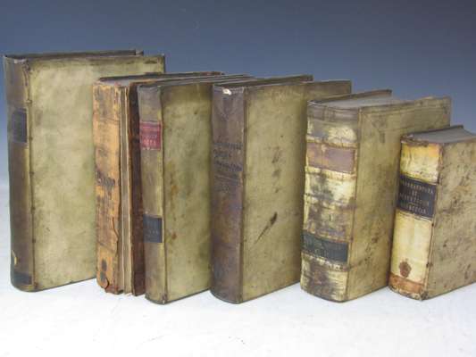 Omnia opera practica. Geneva: J. Stoer, 1623. 4to, contemporary vellum, title with inscription and library stamps, spotting, vellum dust-soiled; Hofmann, Gaspard Institutionum medicarum libri sex. Lyons: J.A. Huguetan, 1645. 4to, additional engraved title, title printed in red and black with engraved vignette, later half calf, dampstained & spotted, worn, one cover detached; Du Chesne, Joseph Pharmacopoea dogmaticorum restituta. [Geneva]: 1607. 8vo, lacking engraved title and portrait, dampstaining; [bound with] Du Chesne, Joseph Diaeteticon polyhistoricon. [Geneva], 1607. 8vo, 2 works in one volume, contemporary vellum, spotting and dampstaining, Harder, Johan J. Apiarium observationibus medicis centum. Basle: J.P. Richter, 1687. 4to, contemporary vellum, lacks plates, spotting & browning; Linden, J.A. van der De scriptis medicis libri duo. [Nuremberg, 1686], 4to, contemporary vellum, lacks engraved title and half of printed title, spotting; Scribonius, Largus Compositiones medicae. Padua: P. Frambotti, 1655. 4to, woodcut device on title, half-title, contemporary vellum, all bindings slightly dust-soiled; sold not subject to return (6)