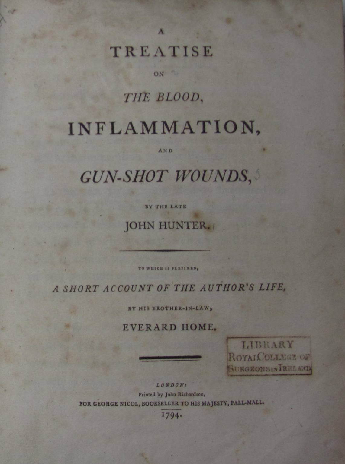 A treatise on the blood, inflammation and gun-shot wounds. London: G. Nicol, 1794. First edition, 4to, 9 engraved plates, contemporary calf, library stamp on title, lacks portrait, slightly spotted, once rebacked, covers detached