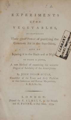 Experiments upon vegetables. London: P. Elmsly & H. Payne, 1779. First edition, 8vo, [34 ll.], 302, [9 ll.], folding plate, later calf, library stamp to title and several other leaves, text and plate spotted, binding worn, cover detached