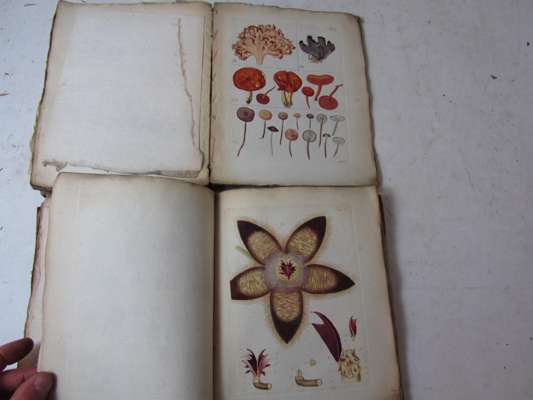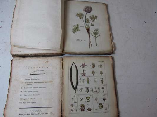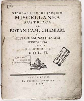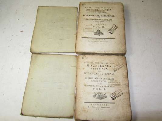 Miscellanea Austriaca, ad botanicam, chemiam, et historiarum naturalem spectantia. Vienna: ex officina Krausiana, 1778-81. 2 volumes, 4to, 44 hand-coloured engraved plates, original printed decorative wrappers, uncut, library stamps to titles and several other leaves, text somewhat spotted and browned, a little dust-soiling to extreme margins of plates, wrappers worn and soiled, two wrappers detached