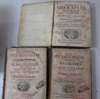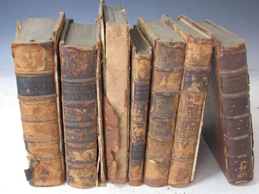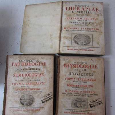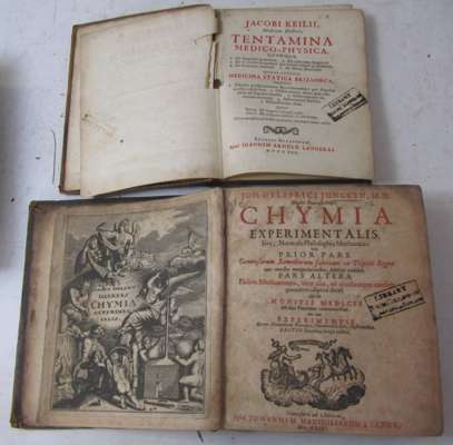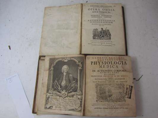 Opera omnia anatomica. Leiden: T. Haak & S. Luchtmans, 1729. 4to, additional engraved title, 8 folding engraved plates, engravings in text, several plates torn or repaired without loss, library stamp to engraved title, half calf, rather spotted, lacking upper cover; Keill, James Tentamina medico-physica. Leiden: J.A. Langeram, 1730. 4to, title printed in red and black, 2 engraved plates, contemporary calf, library stamp on title, covers detached; Juncker, Joannes Conspectus therapiae generalis. Halle, 1725 [bound with] Conspectus formularum medicarum. Halle, 1723; Idem Conspectus physiologiae medicae et hygienes. Halle, 1735; Idem Conspectus pathologiae. Halle, 1736, 3 volumes, contemporary calf, browned and spotted, one cover lacking, worn, several covers detached; Jungken, Johann Helffrich Chymia experimentalis. Frankfurt, 1701. 4to, additional engraved title, contemporary calf, browned and spotted, cover detached; Hamberger, Georg Erhard Physiologia medica. Jena, 1751. 4to, title printed in red and black, engraved portrait, 8 folding engraved plates, calf, library stamp to title, some browning and dampstaining, worn, lacks lower cover (7)