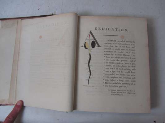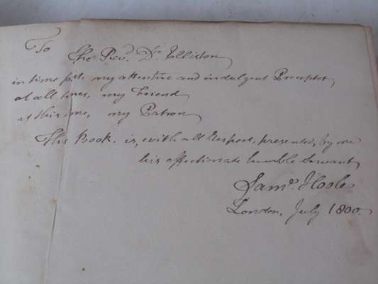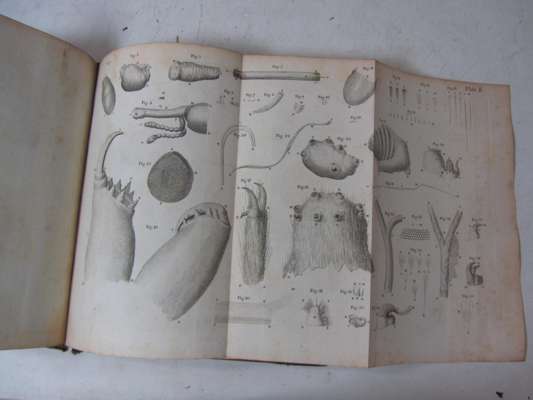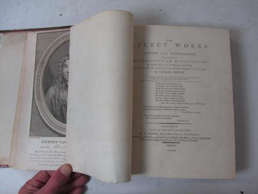 The select works of Anthony van Leeuwenhoek, containing his microscopical discoveries... translated from the Dutch and Latin editions published by the author, by Samuel Hoole. London: printed for the translator, 1800 [Volume 2: London: Printed by the Philanthropic Society, 1807]. Presentation copy inscribed on front endpaper "To The Rev. Dr. Elliston, in times past, my attentive and indulgent Preceptor, at all times, my Friend, at this time, my Patron. This book is, with all respects, presented by me, his affectionate humble servant, Samuel Hoole, London, July 1800". 2 volumes in one, 4to, [iv], viii, [iii-viii], 160; [ii], a-h, [viii], 161-314; [iv], 344, viii; engraved frontispiece portrait and 22 engraved plates, (20 folding), initial engraved letter on p. III hand-coloured, half-title to volume 2, contemporary half calf, plates somewhat spotted, blindstamp to titles and some text leaves, no inked library stamps, rubbed, one cover detached
