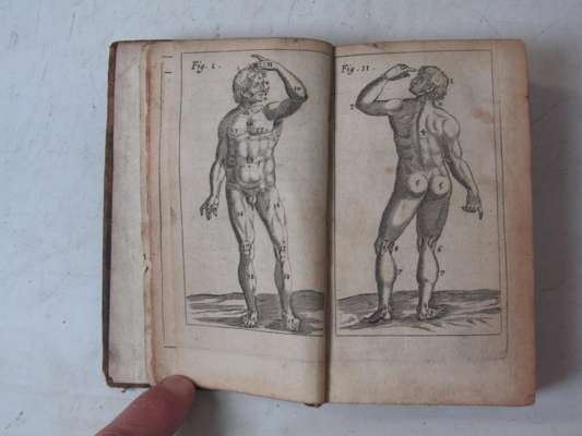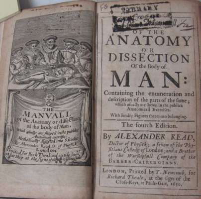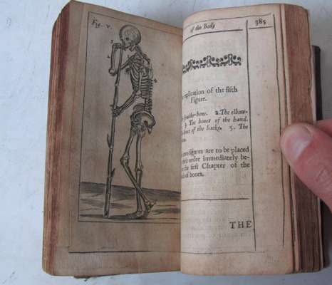 The manuall of the anatomy or dissection of the body of man. London: T. Newcomb for Richard Thrale, 1650. Fourth edition, 12mo, [10], 446, [12], additional engraved title and 5 engraved plates, eighteenth century calf, I11 torn without loss, slightly spotted, library stamp to title, rubbed, upper cover detached