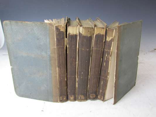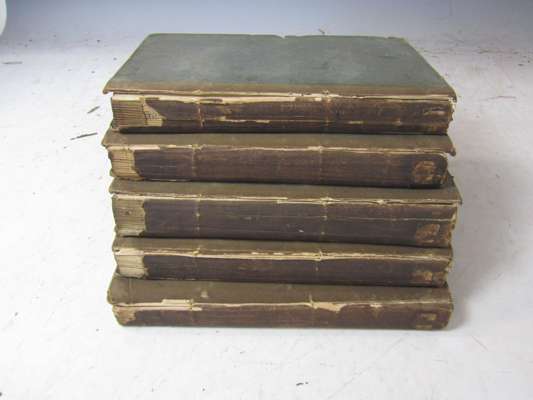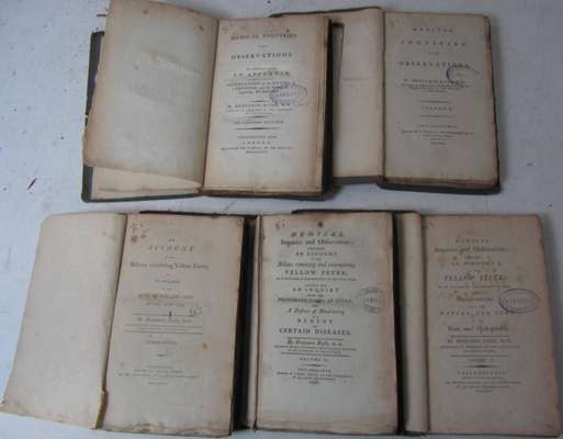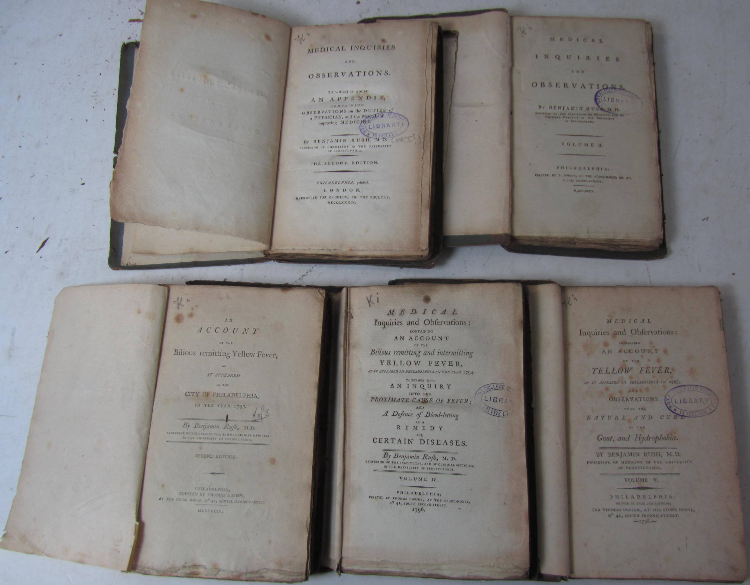Medical inquiries and observations. Volume 1: Philadelphia, printed, London, reprinted for C. Dilly, 1789 [volume 2-5 Philadelphia: T. Dobson, 1793-1798], 5 volumes, 8vo, volume 1 and 3 Second edition, uniform original boards, uncut, library stamp to titles and several other leaves, half-titles in volumes 1 and 4 only, some spotting, some discolouration and dust-soiling, bindings worn, some loss to spines, some covers detached