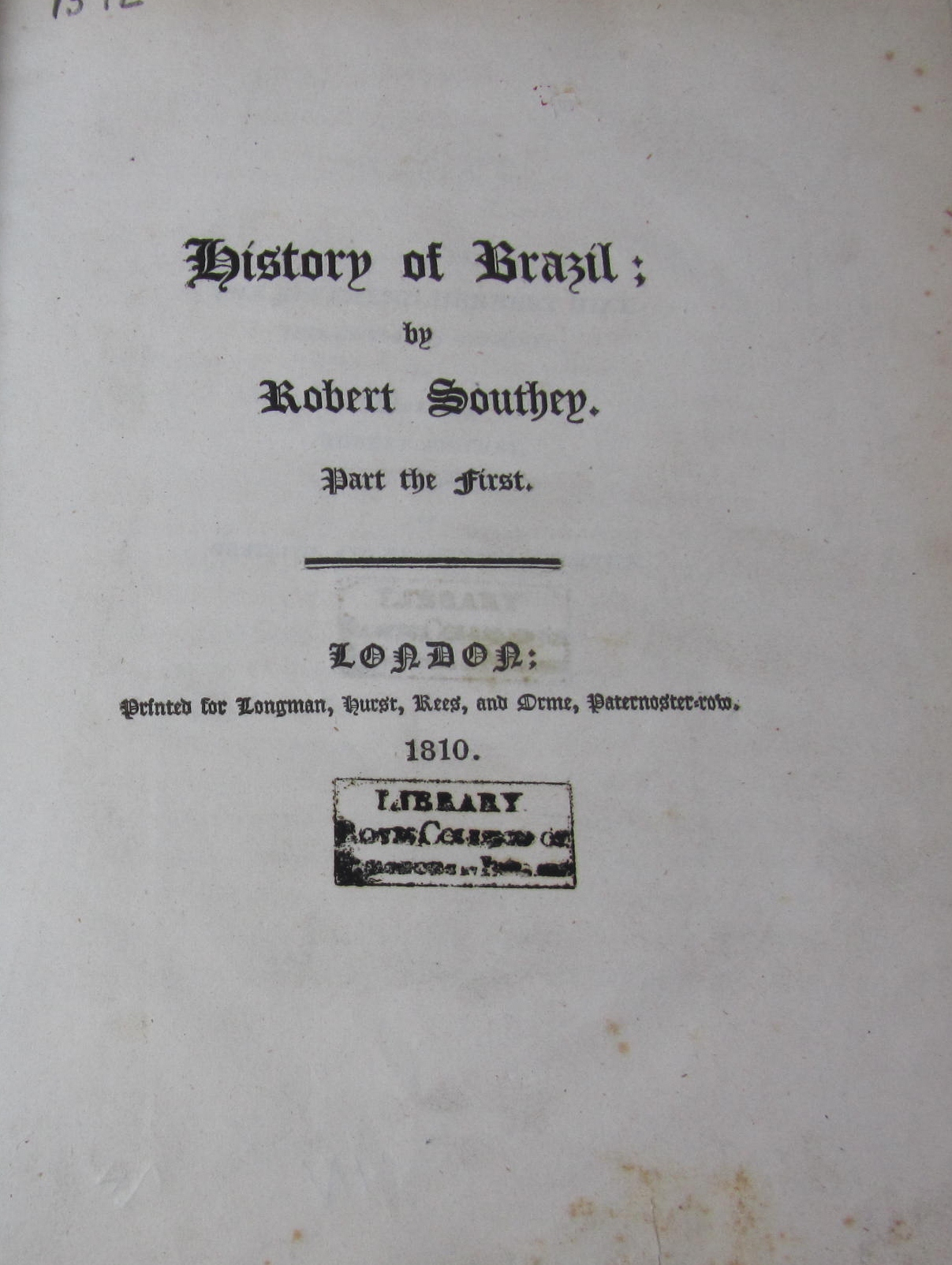 History of Brazil. London: Longman &c., 1810-19. First edition, 3 volumes, 4to, 1 folding map, contemporary tan half morocco, uncut, library stamp to titles, some spotting, worn