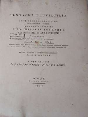 Testacea Fluviatilla quae in itinere per Brasiliam. Munich: C. Wolf, 1827. First edition, 4to, 29 hand-coloured lithographed plates, later half calf, library stamp and blindstamp to title and other leaves, some spotting and light soiling, worn, covers detached