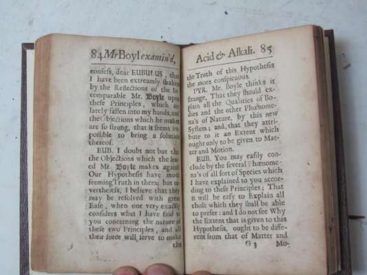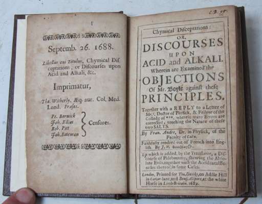 Chymical disceptations, or discourses upon acid and alkali. Wherein are examined the objections of Mr Boyle against these principles. London: T. Dawks & B. Allport, 1689. 8vo, [16], 166, 30, [4 pages, including blank leaf], modern cloth, imprimatur leaf before title, some spotting