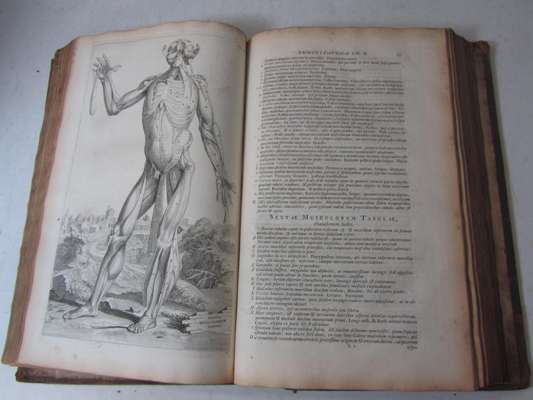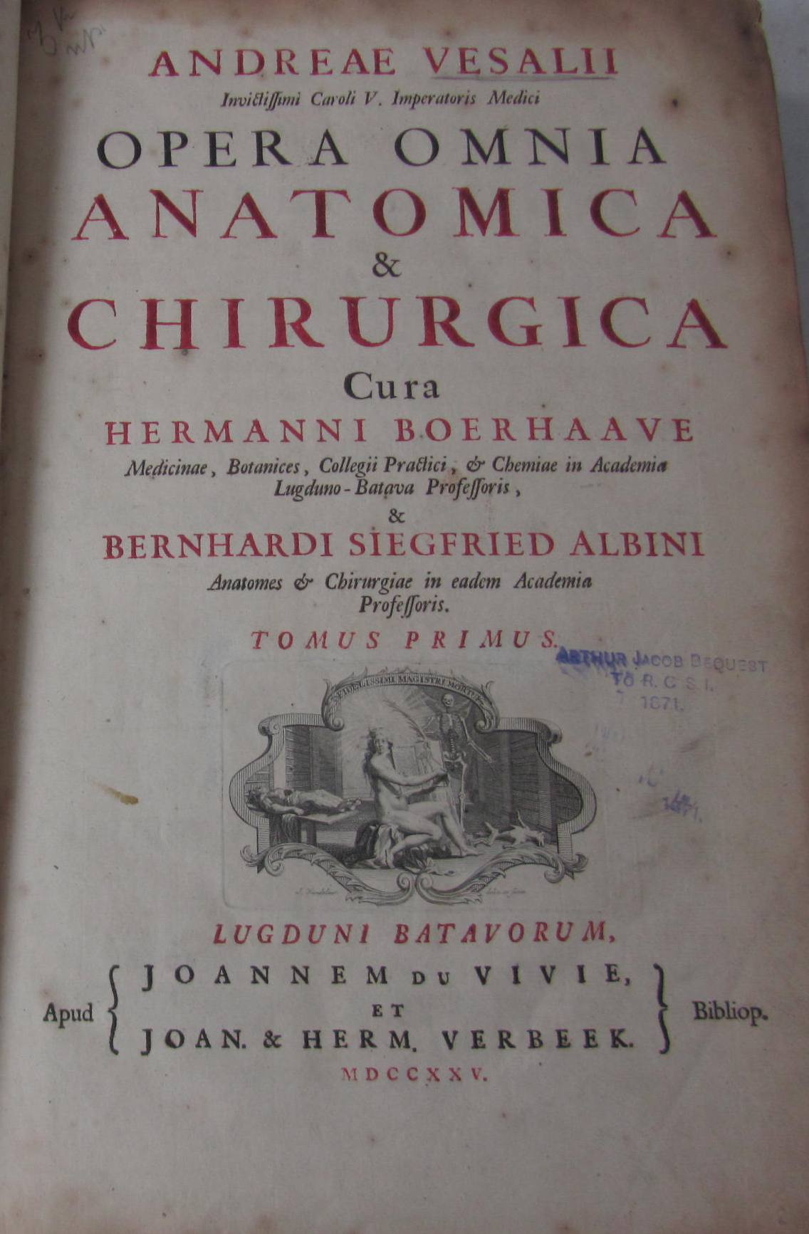 Opera omnia anatomica & chirurgica. Edited by Hermann Boerhaave and Bernhard Siegfried Albinus. Leiden: Johannes du Vivie, Johannes & Herman Verbeek, 1725. Volume 1 only, folio, half-title, plates 1-67, some folding, engraved illustrations in text, contemporary panelled calf, lacking engraved additional title, small tear to folding plates (without loss), library stamp to title and half title, spotting, worn, covers detached