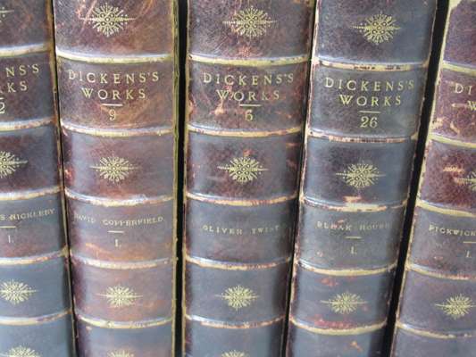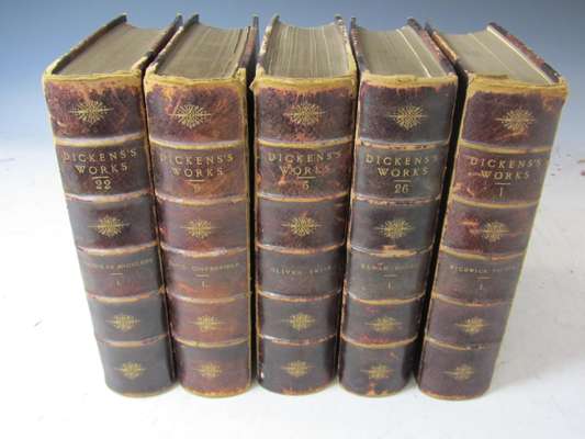 Works. London: Chapman and Hall Ltd., 1881. 4to, 30 volumes, number 285 of 1000 copies of the Édition de Luxe, engraved plates mounted on india paper, with illustrations by Phiz, Marcus Stone, Luke Fildes and others, contemporary half morrocco, t.e.g., others uncut, spines gilt and worn, some rubbing to boards, minor foxing throughout, some loose pages, volume 14 spine detaching at top (30)