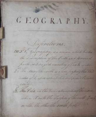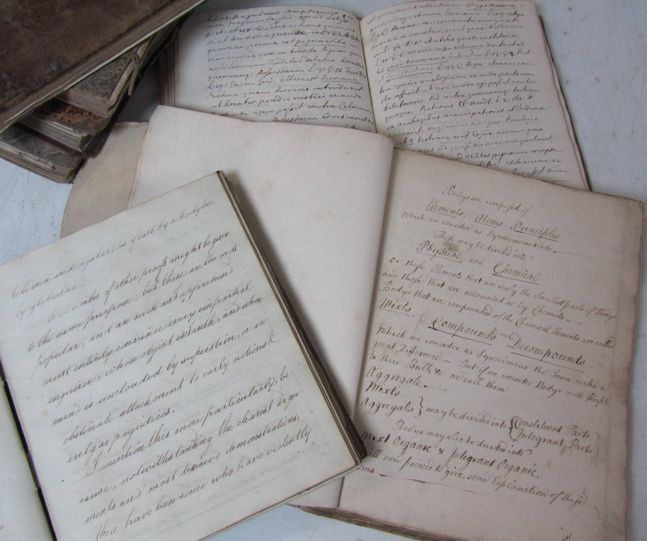 Manuscript notebook, entitled "Geography", c.1794, illustrations and folding tables, a study written in a very neat hand by a keen and thorough student, later inserted note claims the manuscript is the hand of a student of atomic theory pioneer James Dalton of Kendal, contemporary calf, worn at edges, leaves loose, lacking front endpaper/ ownership leaf; Medical Manuscript, approx. 38 pages, entitled "An essay on the diseases most fatal to infants", 1798, some dustmarking; and 6 other manuscript notebooks (8)